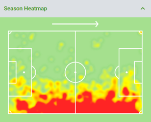 In terms of positioning, his season heatmap (left) shows his hybrid position between a centre- and a left-back (on the right, heatmap of Marc Guehi).
